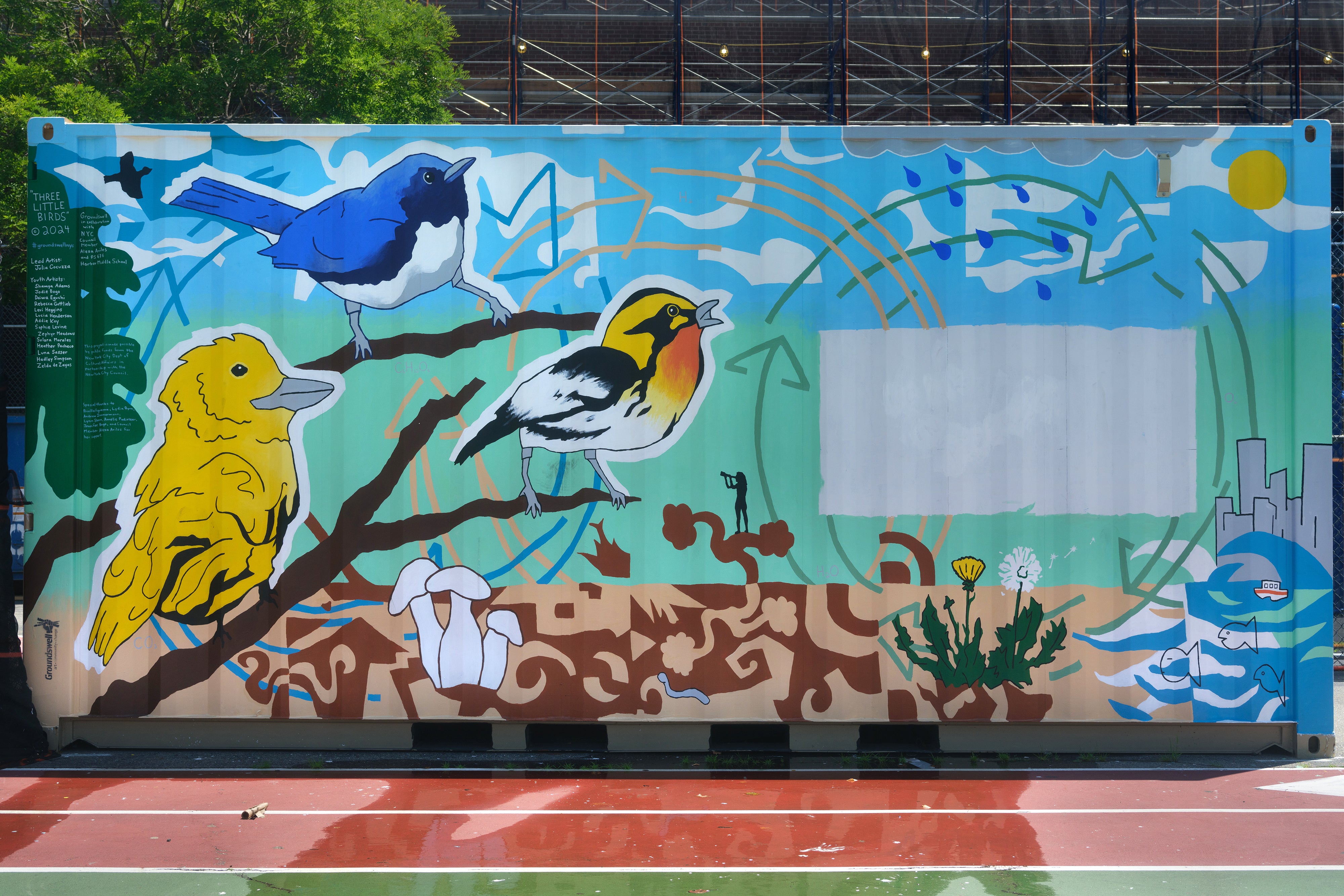 Students from the school’s “Green Team” club worked with Groundswell—a community mural organization—to plan the design for the container, which features three colorful warblers that migrate through New York. The birds' surroundings highlight how local ecology is woven together, from the blue waves lapping near buildings on the shore to the circular arrows symbolizing cycles of matter and energy. “We wanted it to show the interconnectedness of the natural or native ecosystem with the human, highly built environment that we have in Red Hook,” says Andy Zimmermann, a seventh grade teacher at the school.